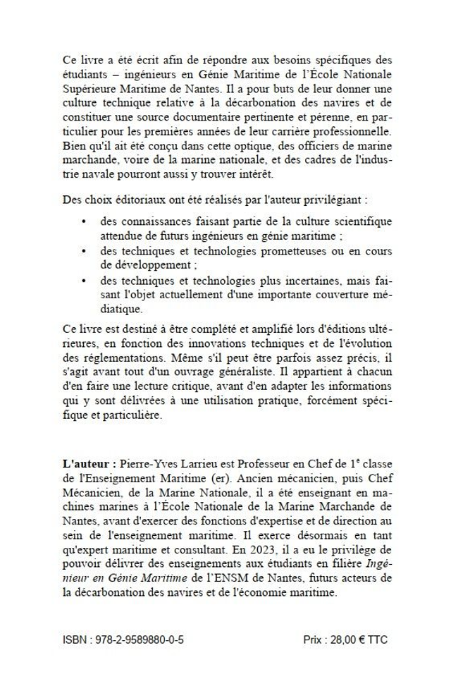Ce livre décrit la réglementation relative à la décarbonation des navires, l'état de l'art des technologies, solutions et carburants alternatifs permettant de décarboner les navires, et les perspectives d'évolution en la matière. Il a été écrit initialement afin de répondre aux besoins des étudiants – ingénieurs en Génie Maritime de l’ENSM de Nantes. Il a pour buts de donner une culture technique relative à la décarbonation des navires. Technologie et réglementation évoluant, il a vocation à faire l'objet d'éditions ultérieures d'ici quelques années. Bien qu'il ait été conçu dans cette optique, des officiers de marine marchande, voire de la marine nationale, et des cadres de l'industrie navale pourront aussi y trouver intérêt. Le fascicule "Approfondissements & études de cas", qui constitue une mise à jour à la date de mai 2025, y est joint sans supplément de prix.